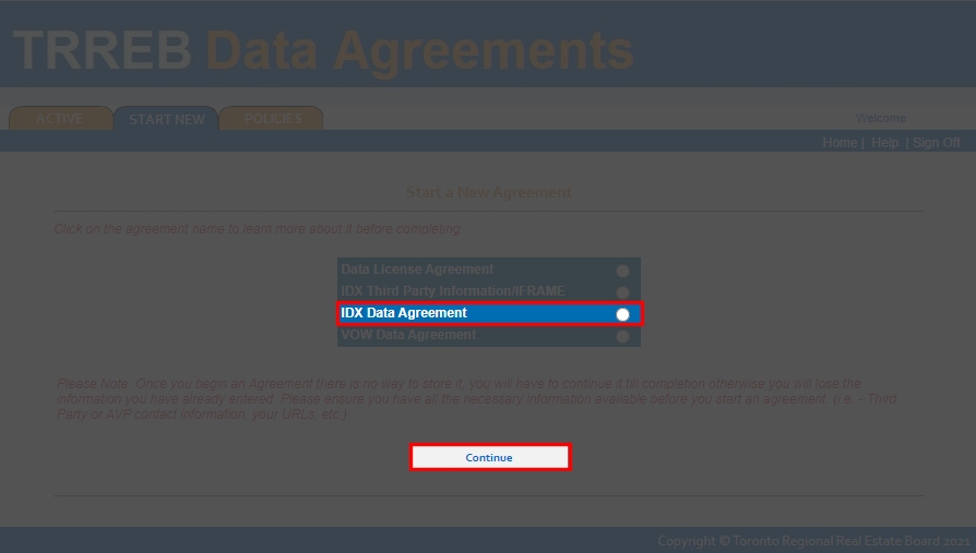 Step 8: Click on IDX Data Agreement and then click Continue.